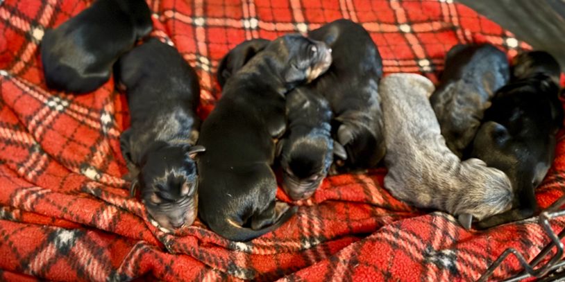 Our beautiful litter of purebred Doberman Pinschers includes 2 black and tan females, 1 blue and tan female, and 5 black and tan males. They are being raised with daily socialization and plenty of love to help them grow into confident, well-rounded companions. Born on November 14, they will come with age-appropriate vaccinations and deworming, and will be ready for their new homes on January 9.