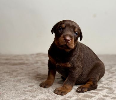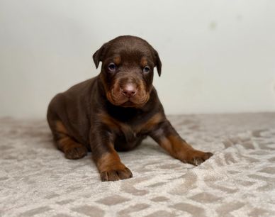 Dmitri — a handsome European Doberman male with a smooth red coat and that unmistakable Euro head and expression already coming in. Dmitri is the type of pup that will grow into a loyal shadow—always close, always watching, and ready to match your energy.