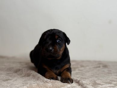 Nadia — a stunning Black & Tan European Doberman female with the kind of presence you can feel even as a newborn. Nadia represents everything that makes European Dobermans special: strong bone, clean structure, and that calm, serious temperament that grows into a loyal family guardian.